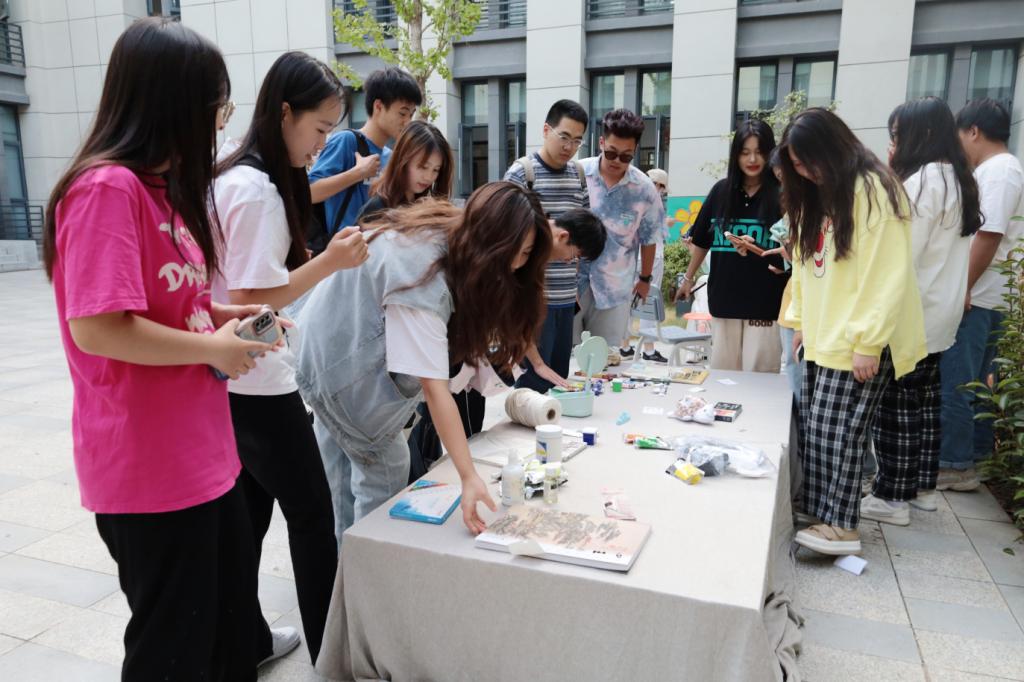 教学楼广场中央聚集了不少前来“淘宝”的2022级新生们。原来,为了方便新生购买绘画工具、生活用品,该院特意开展了一场“百宝淘”活动,将学长学姐们的闲置物品收集并摆摊售卖,由新生们低价购入,实现物品的循环利用。