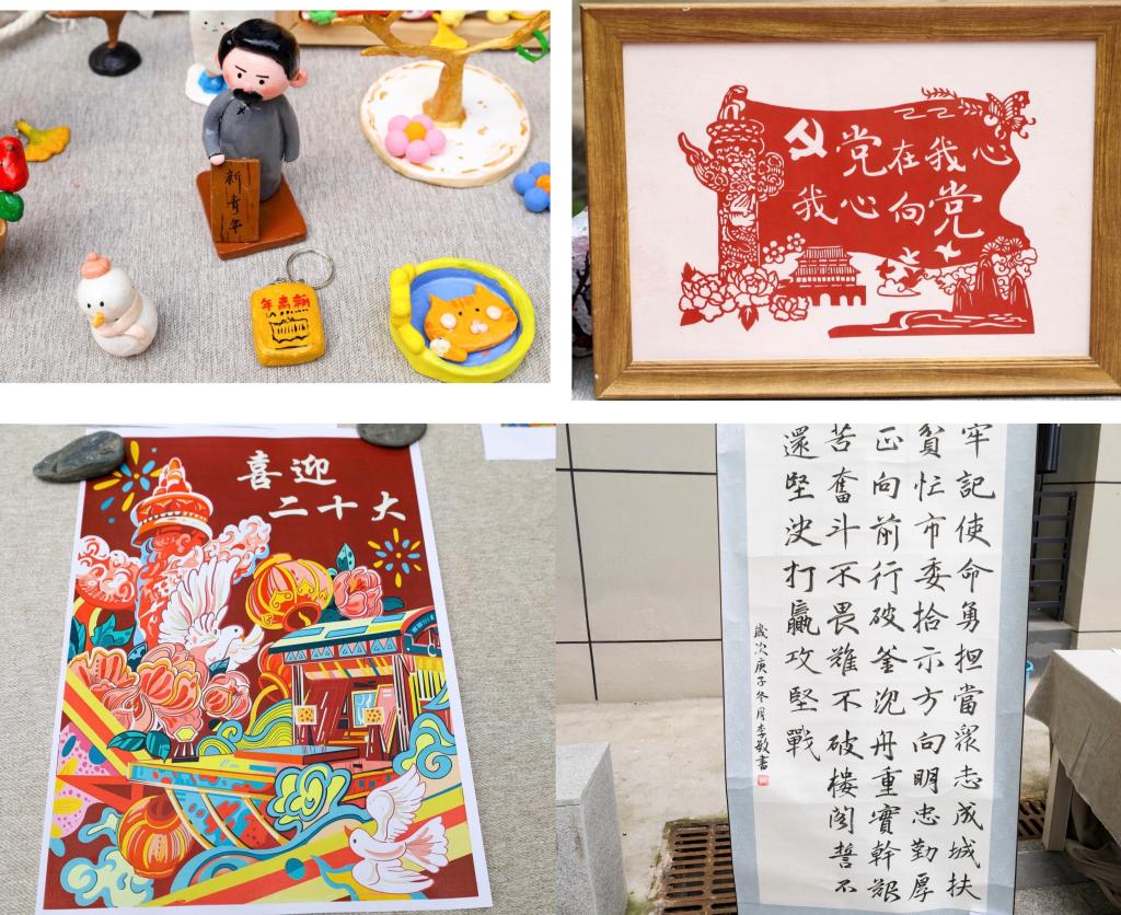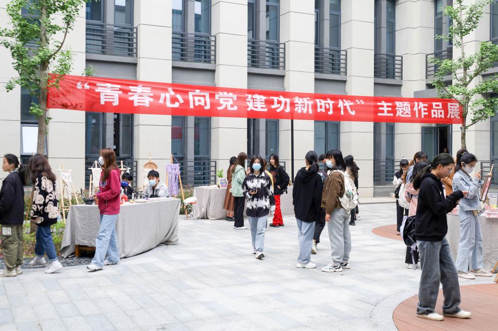 教学楼广场中,陶艺、石塑黏土、墙绘等500余份艺术作品齐亮相,同学们以笔墨寄情、以作品言志,用丰富多彩的艺术形式喜迎党的二十大,庆祝中国共产主义青年团成立100周年。