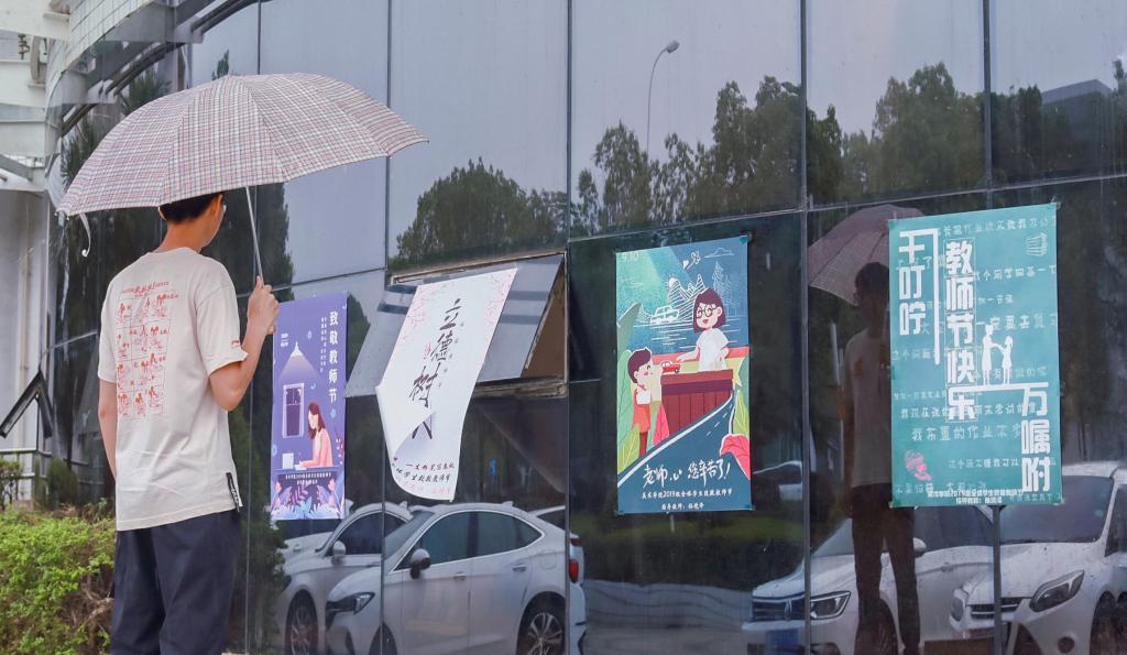 除了教职工,活动还受到了不少学生的关注。计算机大类专业2019级的陈晓环来到教职工食堂附近领取新书,看到了展出的海报作品后便和同学一起前来观看。“虽然并不懂海报专业方面的设计,但活动营造的这种尊师敬师的氛围倒是触动我了,让我想起了自己的老师,回去之后哪怕是发条问候短信我也要给老师送上一份真挚的祝福!”