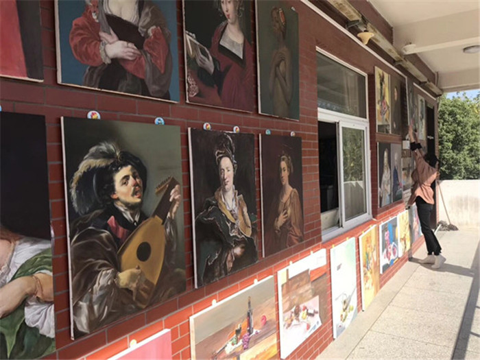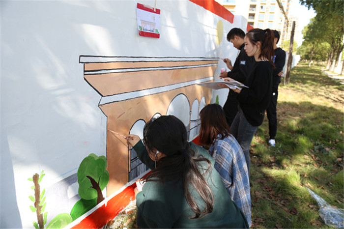 的665名学生分批在学校西围墙上进行墙绘,为学校打造了一道靓丽的风景线,引得在校学生们纷纷拍照留念。(易惠)