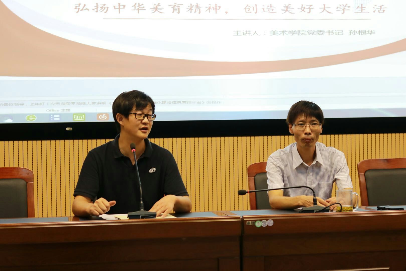 老教授的回信》,结合习近平总书记回信中提及的“四个坚持”,勉励同学们以德为本,扎根生活实践,遵循美育规律,弘扬中华传统美德。其次,回顾了新中国成立以来美育的发展历程,使同学们更加了解美育内涵,从而有意识的锻造审美能力,提高人文素养。再次,孙根华进一步阐释了为何重视美育,以及如何追求理想境界,展现完美自我。最后,就怎样度过美好的大学生活,从美育的角度创就如何新学生活动提出了几点建议。