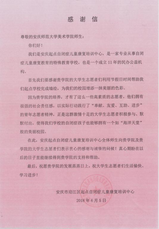 送来感谢信,表达对该院“美之源”墙绘工作室的学生们利用节假日帮助该校绘制校园墙绘志愿活动的感激之情,并高度评价了学生们的专业能力和墙绘成效。