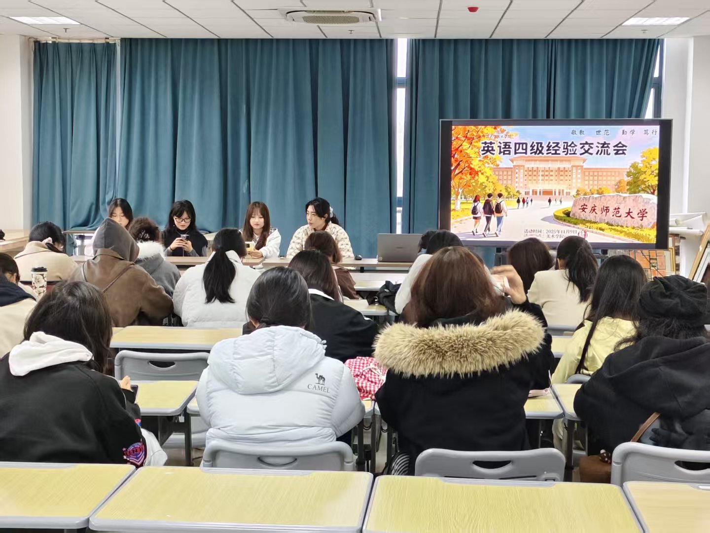4名已经通过英语四级考试的同学进行经验交流和分享,2025级新生参加了此次活动。