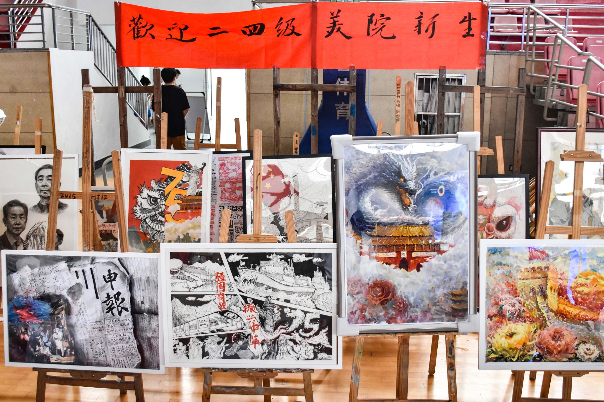 新生作品展上一幅画的内容。随着新生报到的进行,画架上的作品越来越多,来往的学生、家长不少都被画作吸引,驻足欣赏。