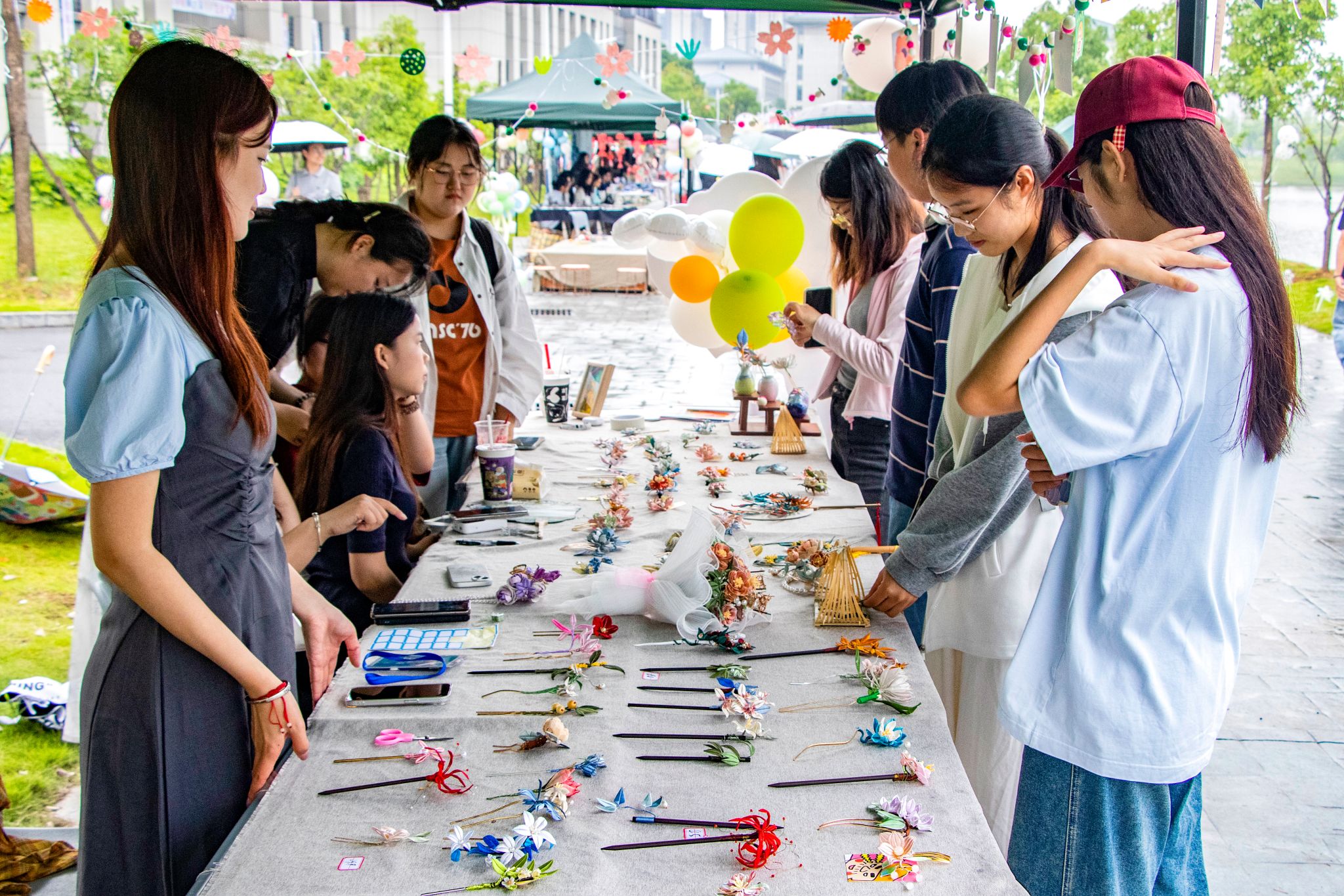 按所需样式剪制纸模,合并蚕丝线细密缠绕,巧手舞动间,精巧的缠花发钗便出现在缠花俱乐部成员的手中。古朴典雅的非遗缠花制品让智能科学与技术专业2020(1)班的刘佳杨在缠花俱乐部展点前驻足良久。“缠花仅用丝线就能让饰品呈现出珠宝般的光泽,这种光泽莹润的美感深深吸引了我。”刘佳杨坦言,虽然是第一次接触缠花作品,但他已经被缠花之美“俘获”。在俱乐部成员的介绍中,他买下了一支发簪,计划日后送给母亲。