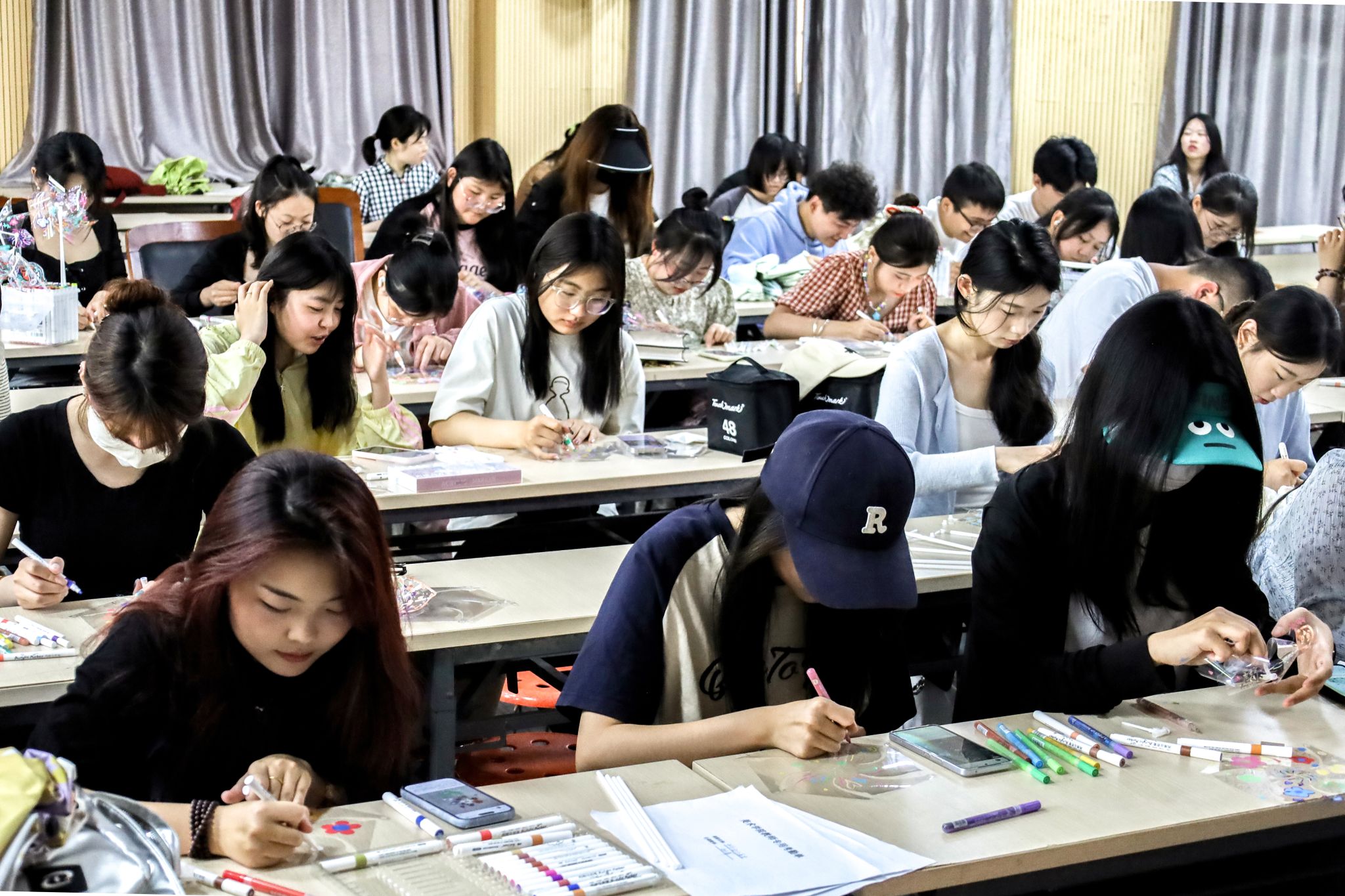 于学院学术报告厅开展“手绘风车‘舞’校园”活动,60余名学生在笔尖流转中描绘缤纷轮廓,在动手组装中体会夏日美好。