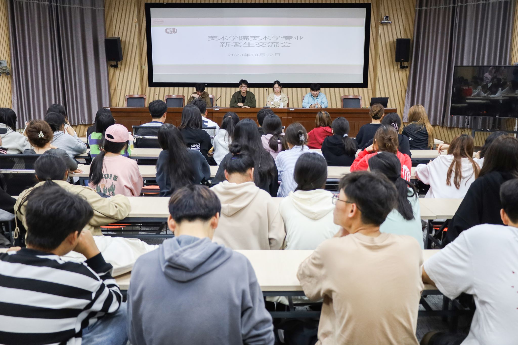 在学院学术报告厅开展了三场不同专业的新老生交流会,分别为美术学、设计学、动画专场交流会,会上邀请了17位学业、专业和实践成绩突出的老生代表为新生们分享经验、答疑解惑,学院2023级230余名新生参与交流会。