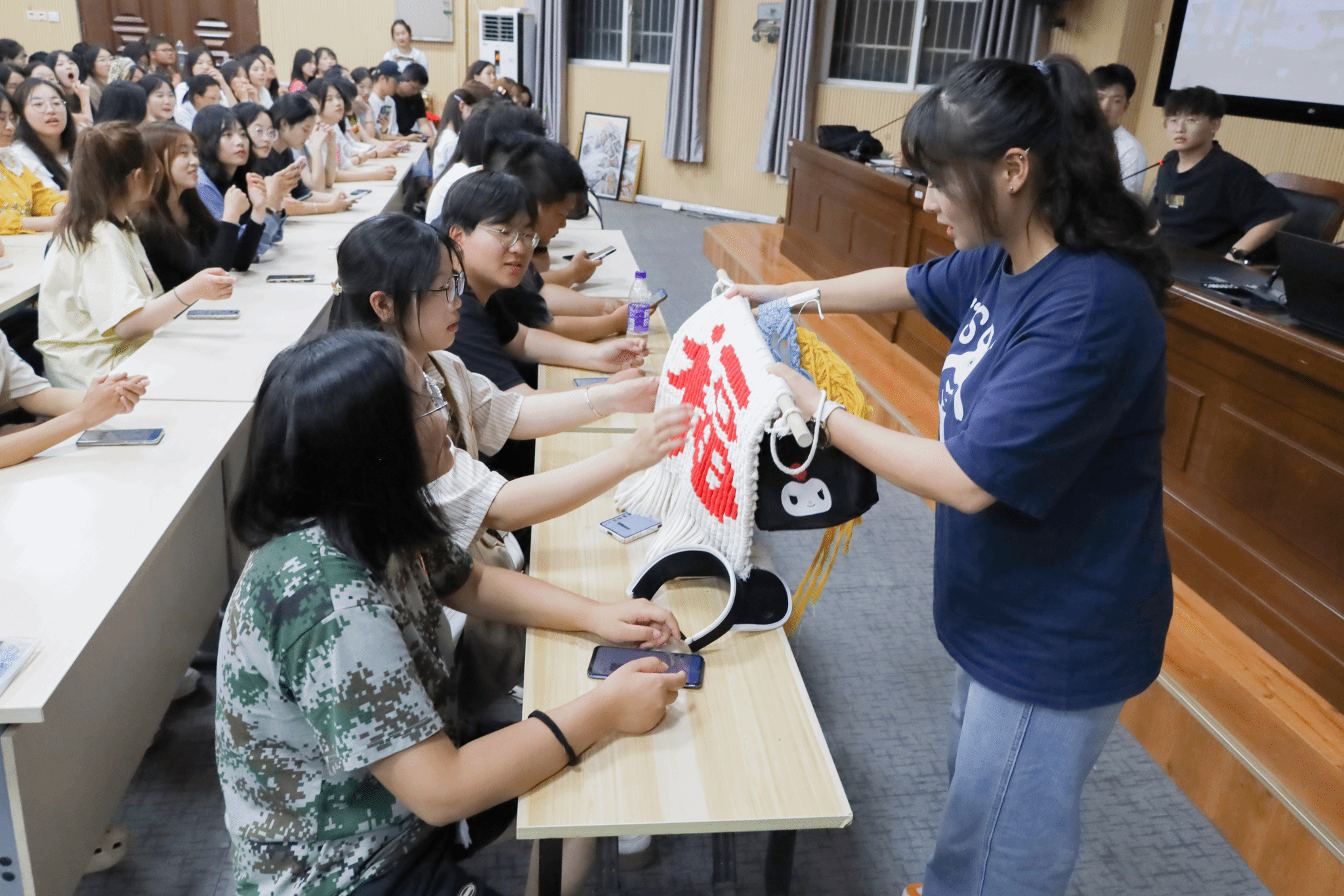学术报告厅内传来阵阵欢呼声。学院11个俱乐部负责人先后携带作品惊艳“亮相”,面向2023级230名新生开展俱乐部招新宣讲。立体生动的缠花、精美细致的剪纸、豪迈刚劲的书法……各类手工艺品一经展出,就赢得了不少新生的“芳心”。