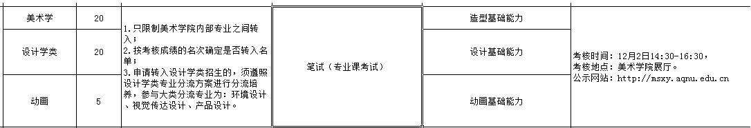 各专业内部转入和转出,美术学4个班级可接收20人,设计大类4个班级可接收20人,动画可接收5人。