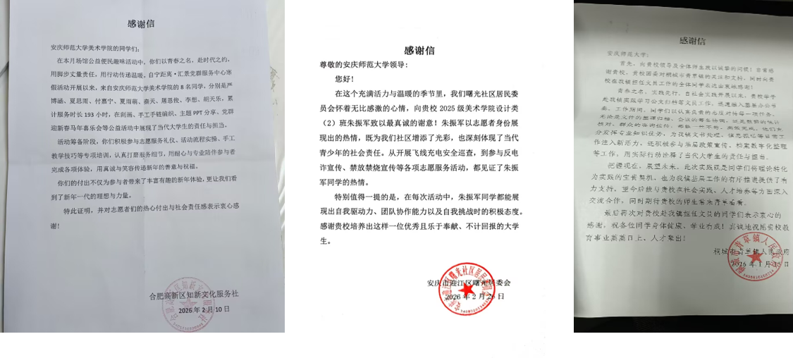 同学们扎实的工作作风、过硬的综合素养与强烈的责任意识,得到各实践单位的充分肯定。学院先后收到马鞍山市雨山区团委、合肥高新区知新文化服务社等多家单位发来的感谢信与荣誉证书,这既是对美院学子实践成果的高度认可,也是学院坚持立德树人、深耕育人实效的生动彰显。各实践单位在感谢信中一致表示,魔性论坛