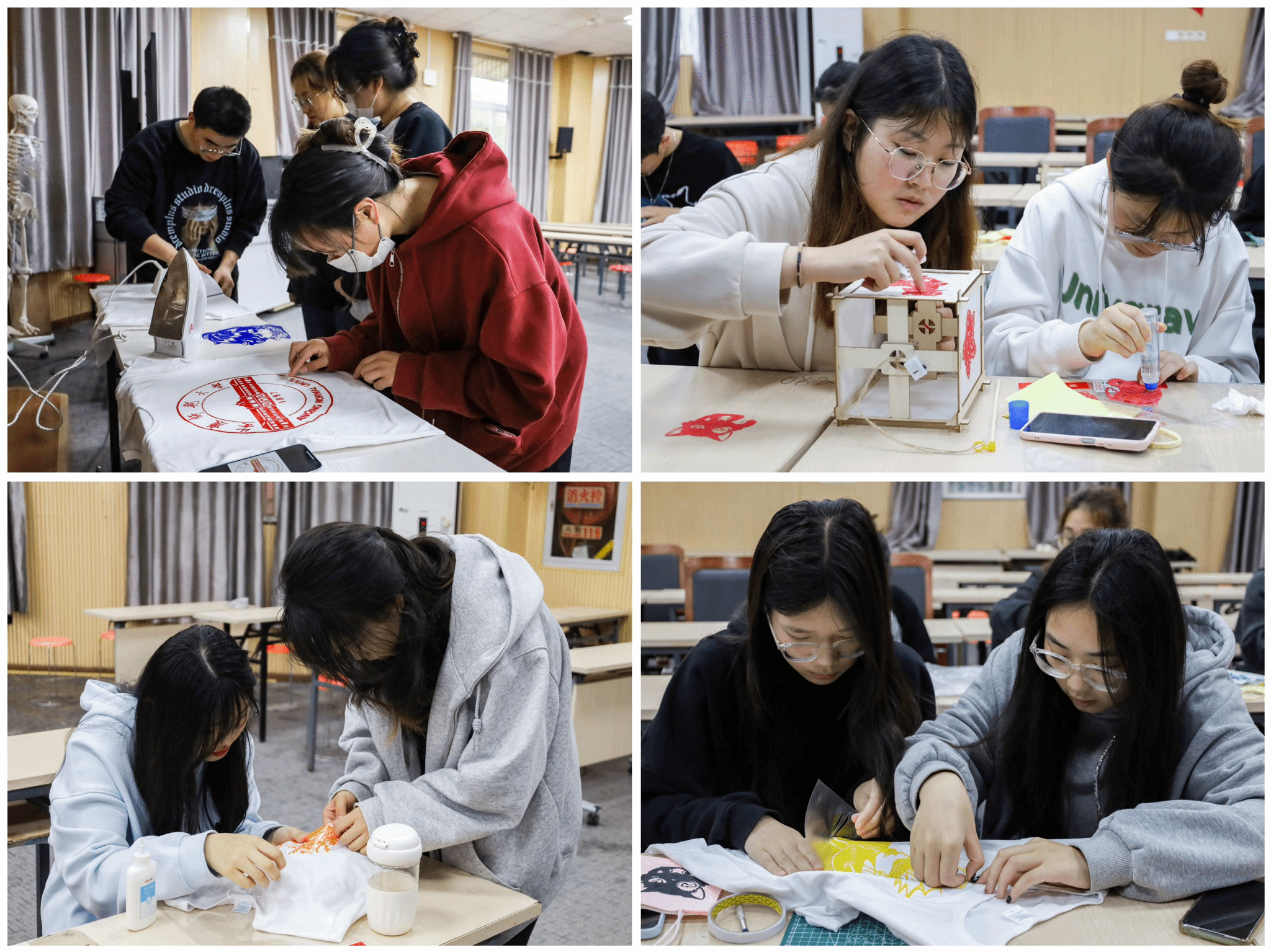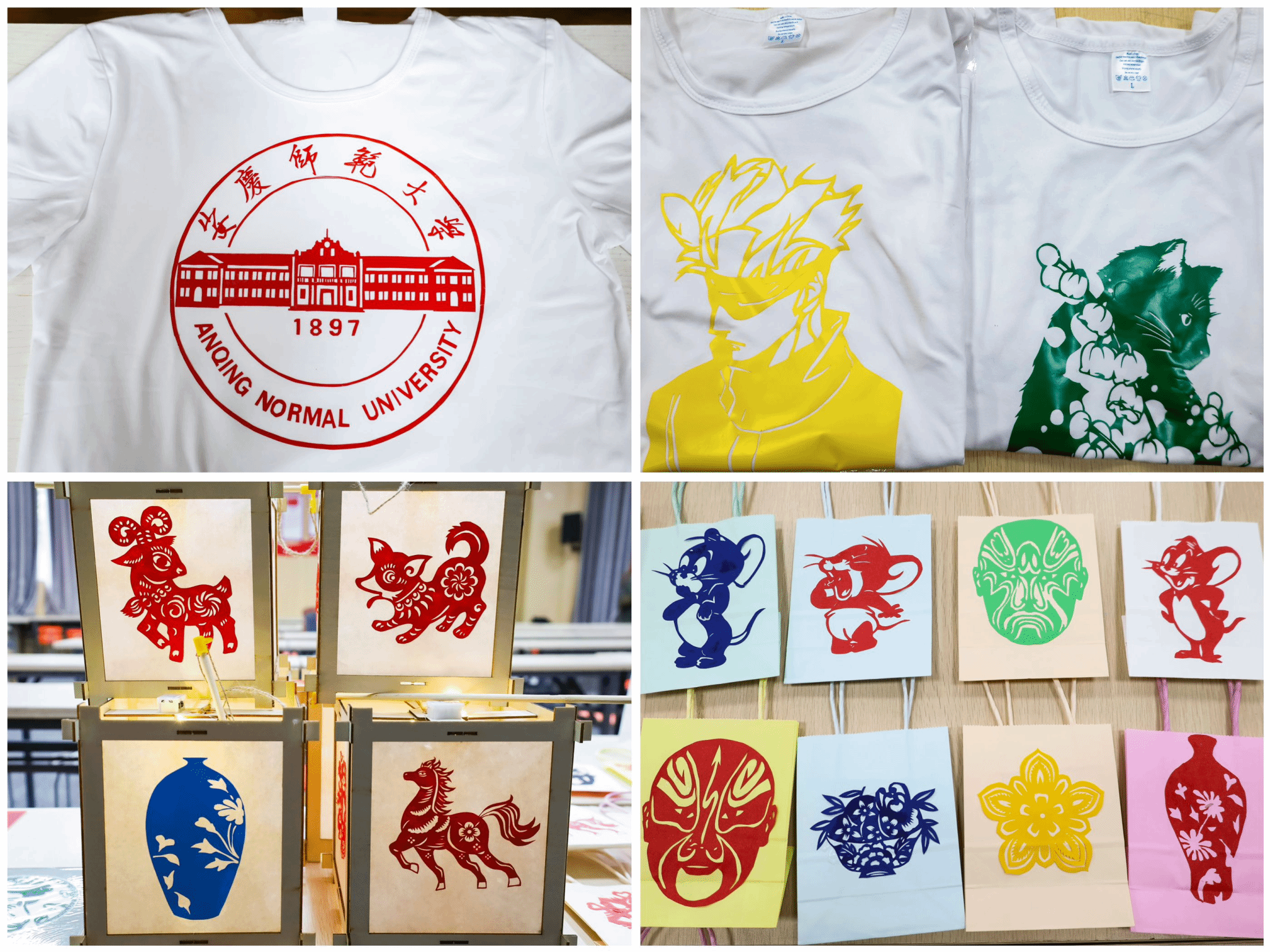 在这一理念的驱动下,半个月前,陶悦与俱乐部成员采购了小型剪纸装裱框、纯白T恤、宣纸灯笼等用品,并在俱乐部每月的教学课程中设计、创作尺寸各异的主题剪纸作品。由于将剪纸图案印在T恤上需要运用热转印技术,转印过程需要逐步试错、实践,俱乐部成员们在日常课程中利用热转印纸边角料与废旧布包进行练习,在实践中掌握每次熨烫的时长与力度。