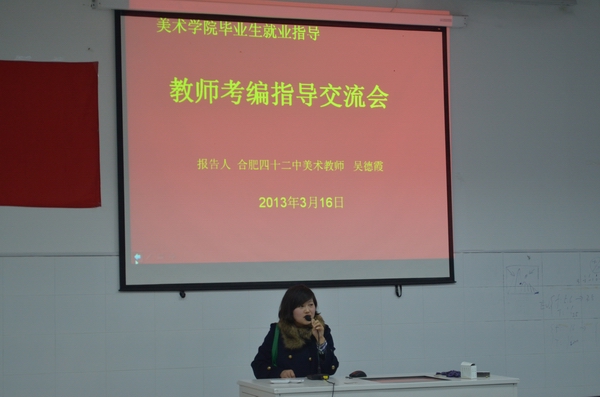 2011届毕业生,来自合肥四十二中的美术教师吴德霞和蚌埠市第三实验小学美术教师吴翔为大家做经验交流和指导。交流会上,两位老师结合各自考编经历,向大家讲述了他们考编的故事。他们一致认为,考编之路虽然辛苦,但一定要明确目标,坚定信心,要怀有一颗坚强的心,才能不畏任何困难和面对各种挑战。他们希望大家在校期间要认真学习专业基础课,努力掌握师范生说课、无生授课、三字一话、教学设计等基本技能;另外,在“专”的基础上还要做到“通”,要熟悉和掌握一些公共基础知识;要认真分析各地招考通知的异同,有针对性的开展复习备考。针对同学们顾忌考编中的人为因素,两位学长告诉大家教师招考各环节都是公开公平,大家要认真准备,不能把希望寄托在别人身上。对于考编不能一步到位,要做两手准备,做好备选方案,分步达到最终目标。