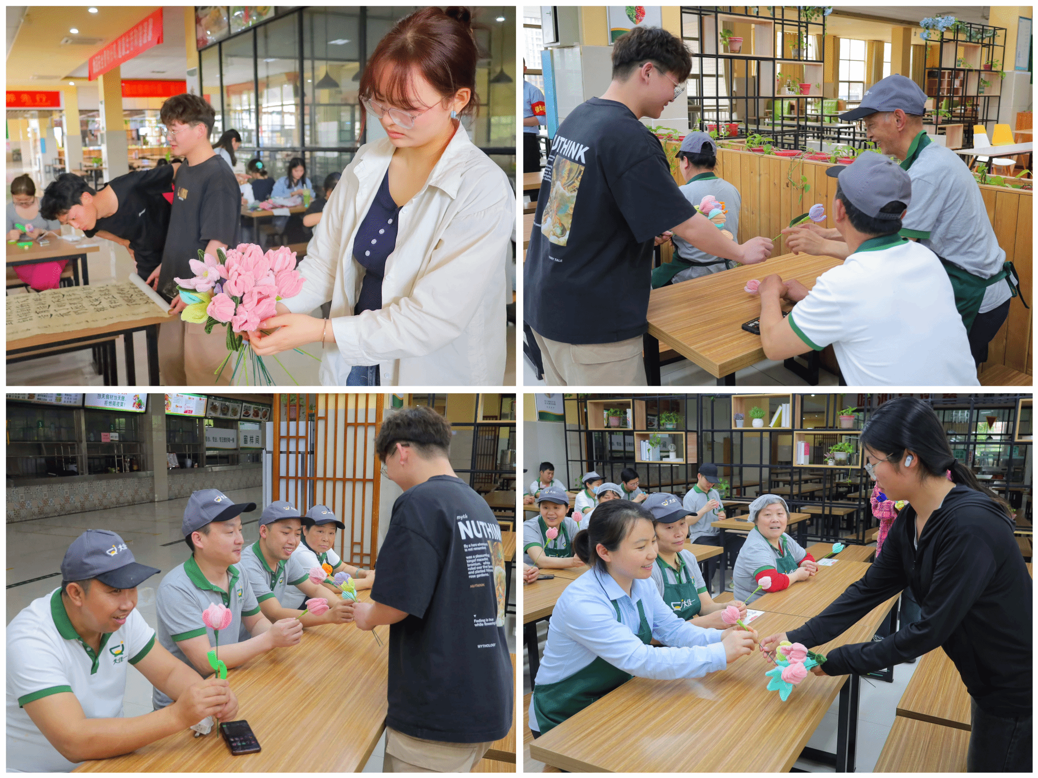 在清点好扭扭棒花卉的数量后,学生们分组将花朵赠送给食堂正在劳作的工作人员,并向他们表达了真挚的谢意。“收到手工制作的花,我打心底感到感动,同学们真的十分用心。”食堂工作人员在收到花束以后,纷纷对手工花朵的精细度表示赞叹。